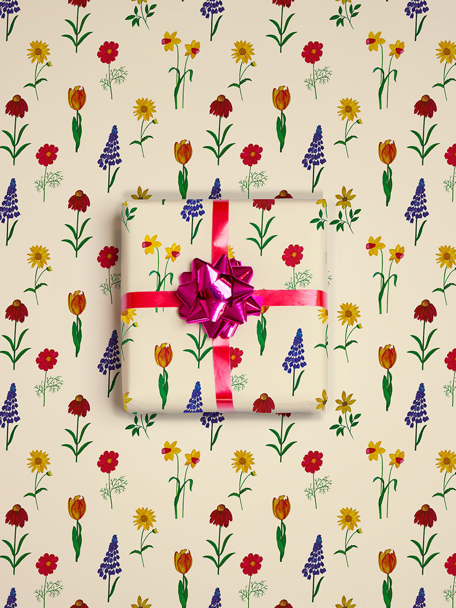 Bursting with colour and charm, Shakera’s Spring Flowers design brings a cheerful meadow to your gift wrapping. Daffodils, tulips, daisies, and hyacinths bloom across a soft neutral backdrop, each brushstroke capturing the joy and freshness of spring. Bright, playful, and full of life — it makes every present feel like a celebration.
