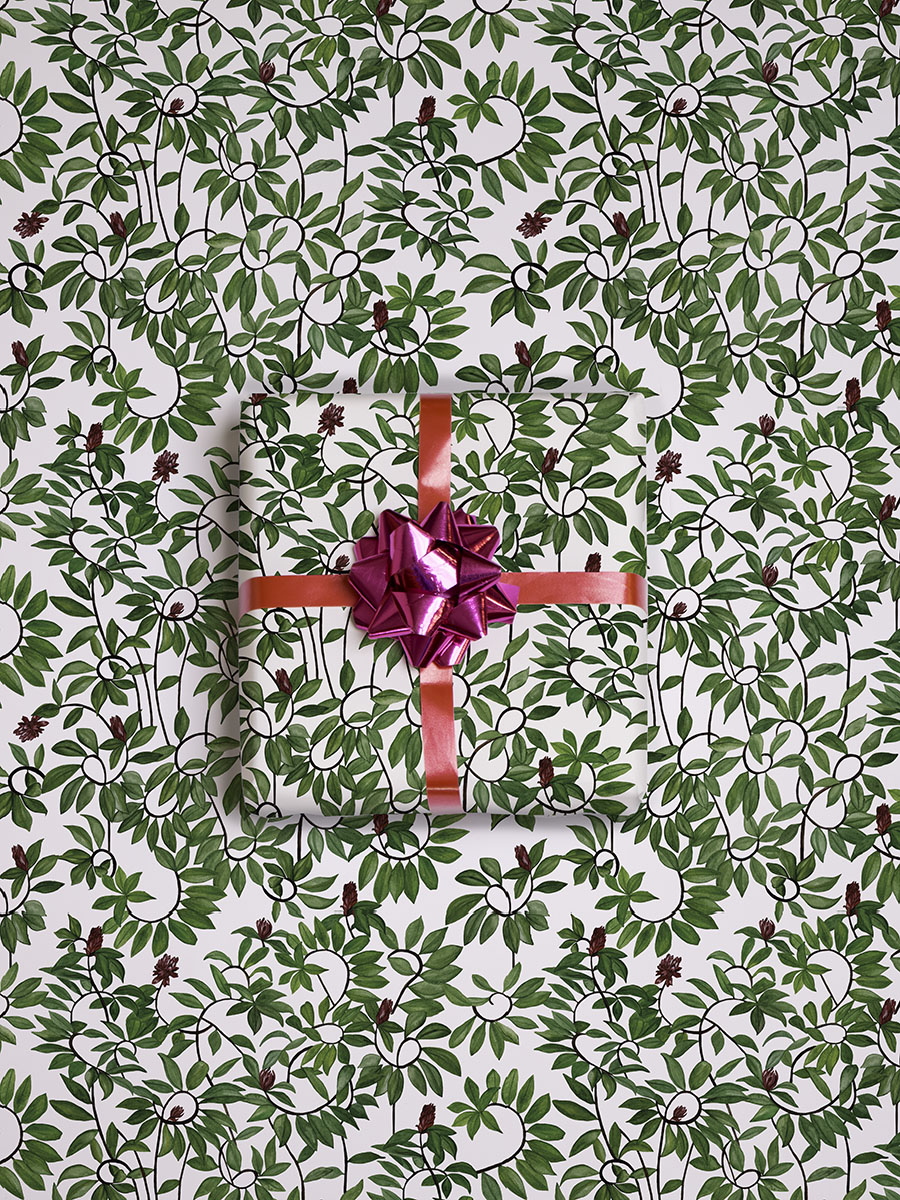 Inspired by tropical foliage, Shakera’s Ginger Plants design is a celebration of lush greenery and natural rhythm. Intertwining stems, curling tendrils, and clusters of deep burgundy buds move gracefully across the sheet, creating a sophisticated and organic pattern. Perfect for those who love the quiet beauty of botanical forms, this design brings effortless elegance to every gift.